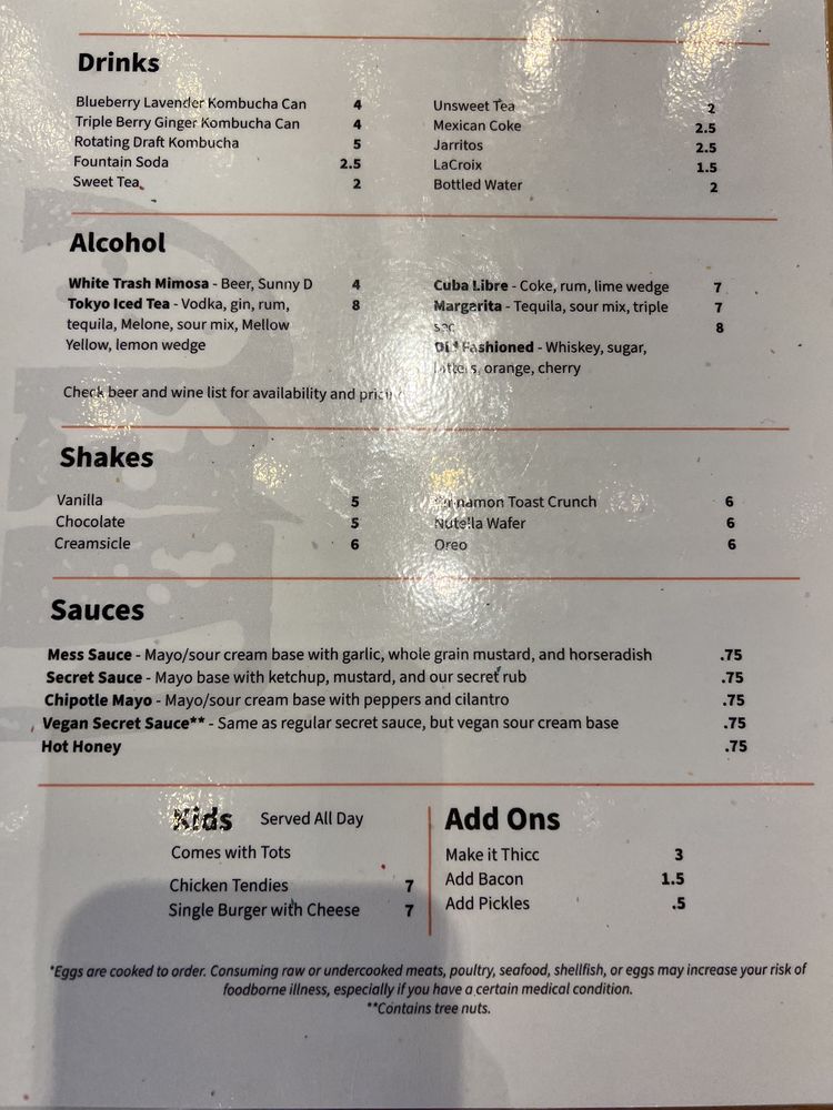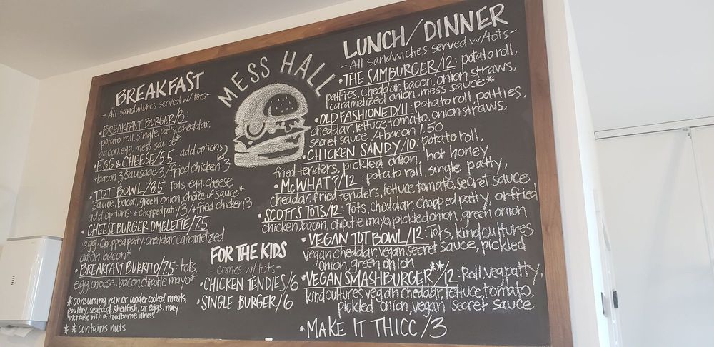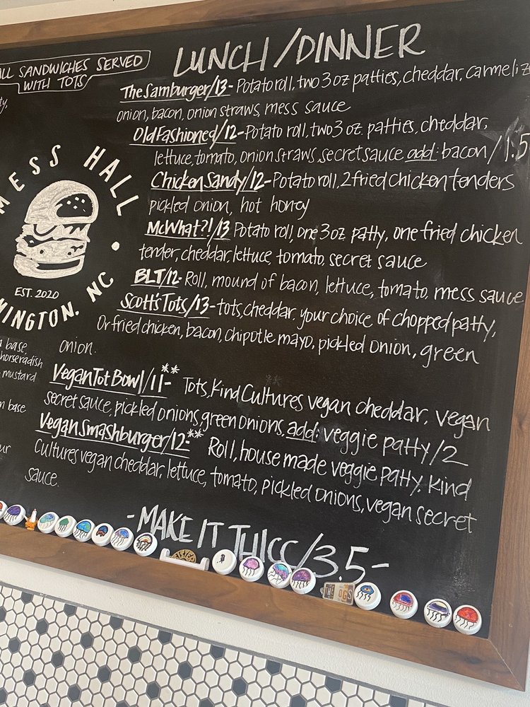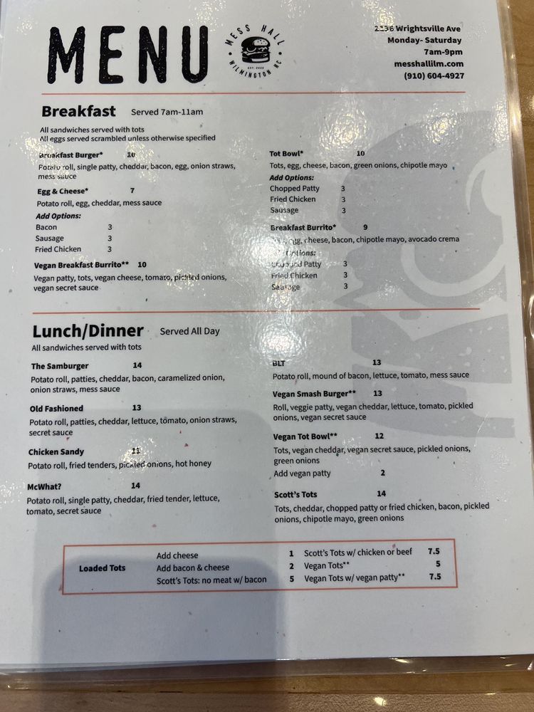 Welcome to Mess Hall, a vibrant burger joint located at 2136 Wrightsville Ave in Wilmington, NC. With an array of options for breakfast and brunch, Mess Hall excels in delivering mouthwatering gourmet burgers and crispy tater tots. Their menu boasts the enticing Samburger, featuring double patties, cheddar, bacon, and a signature mess sauce, alongside an impressive selection of vegan and vegetarian dishes. The atmosphere is hip and casual, perfect for families and groups, enhanced by outdoor seating for sunny days.
